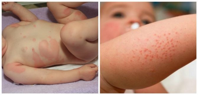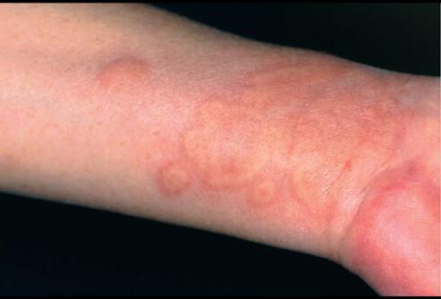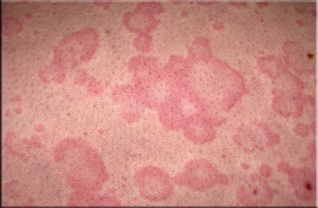 Кожные покровы краснеют, появляются характерные высыпания — плотные волдыри, незначительно возвышающиеся над поверхностью кожи. Элементы сыпи имеют четкие границы, овальную, округлую или линейную форму, окрас волдырей варьируется от бледного до ярко-розового.