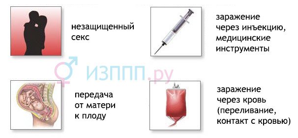 Вирус иммунодефицита может попасть в организм при незащищённом сексуальном контакте, при переливании крови, через недостаточно качественно стерилизованные медицинские инструменты, в частности, шприцы для инъекций, через инструменты нанесения татуировок, декоративных шрамов и проколов, через молоко от матери к ребёнку. Также вирус может проникнуть в организм, попав в кровь через открытые раны.