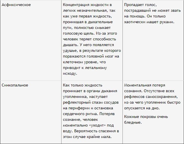 В зависимости от причин могут различаться виды, признаки и, как следствие, первая доврачебная помощь при утоплении.