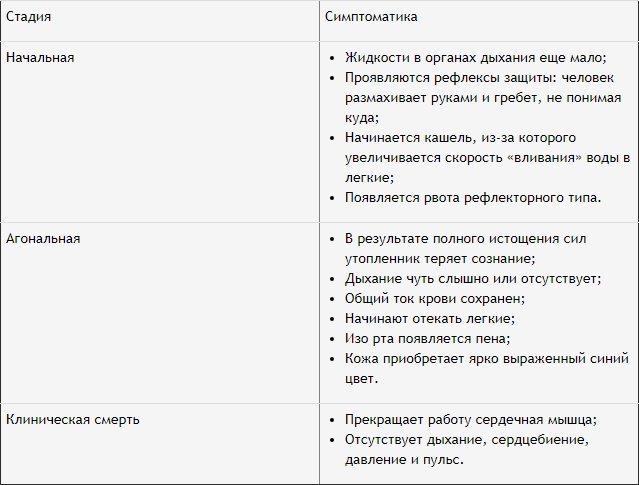 Во время оказания первой медицинской помощи важно ориентироваться, на какой стадии истинного утопления находится пострадавший. Их проявления представлены в таблице.